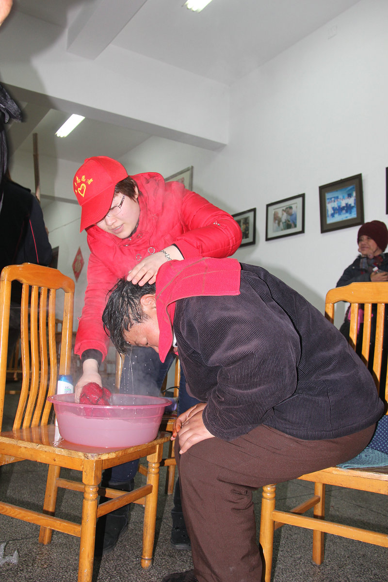 图为九游(中国)志愿者正在为柯桥夕阳红中心老人洗头
