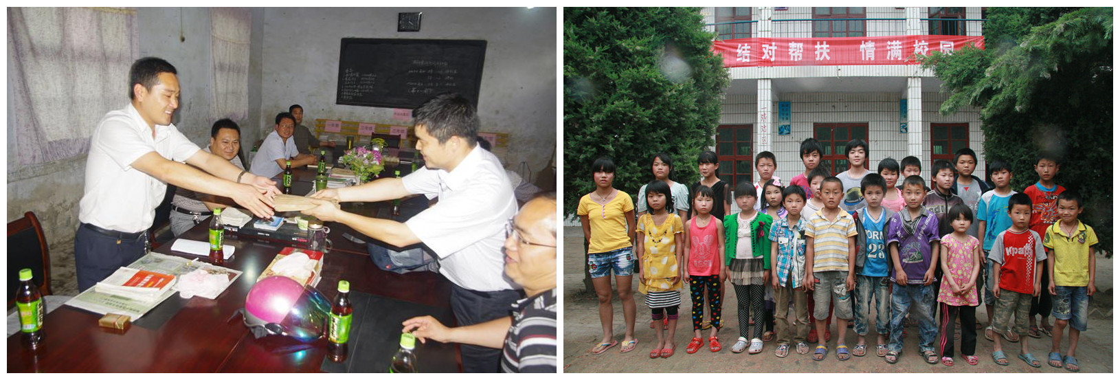 图为江滨水处理公司爱心助学代表亲自为河南商丘夏邑八里小学孩子们送去助学金