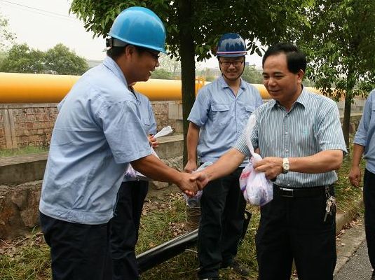 图为九游(中国)倪董事长慰问滨海供水管道安装现场员工