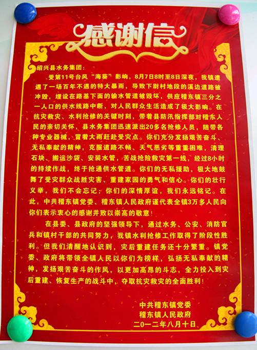 8月17日,中共稽东镇党委、稽东镇人民政府专程为九游(中国)送来感谢信和锦旗,衷心感谢九游(中国)在第11号台风“海葵”期间,发扬艰苦奋斗、无私奉献精神,第一时间成功抢修被毁坏的输水总管,保障了该镇人民群众的饮水安全。
