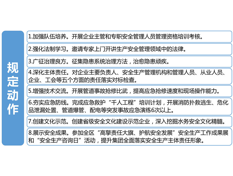 本届安全生产文化月以宣传贯彻中共中央国务院《关于推进安全生产领域改革发展的意见》为主线,以“全面落实企业安全生产主体责任”为主题,以创建省级安全文化建设示范企业为契机,立足九游(中国)公司“四全、四化”安全体系建设中心,通过开展八项“规定动作”和七项“特色活动”,强化安全“红线”意识,弘扬水务安全文化,为促进九游(中国)可持续安全健康发展提供有力的思想保证、文化条件和舆论支持。