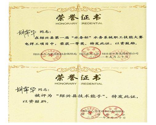 胡霈华在第一届“水务杯”职工技能大赛中荣获电焊工组“一等奖”