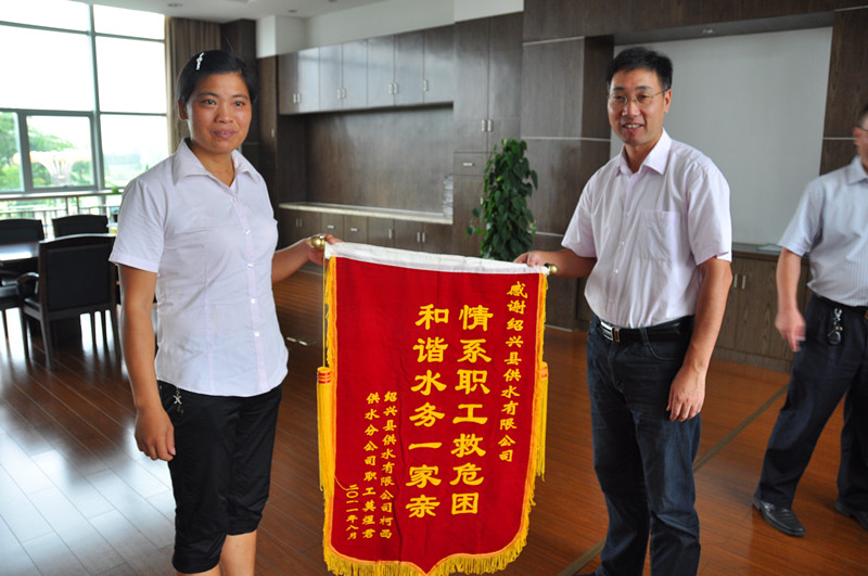 日上午,柯西分公司职工莫煜君在分公司经理田长荣及其所在村村支书的陪同下来到公司送上一面“情系职工救危困,和谐水务一家亲”的锦旗,感谢公司对她的关爱和帮助。