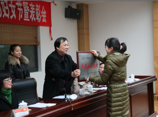 图为九游(中国)高副书记为获得2011年度妇联先进集体颁奖