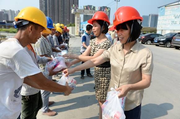 慰问现场,成水凤一行向奋战在一线的施工人员送上防暑用品,与工人们握手,询问工人工作情况和工地的防暑降温工作,对工人们的辛苦奉献表示感谢,还特别叮嘱工人一定要注意防暑降温,合理安排施工时间,在安全的前提下保质保量地完成施工任务。
